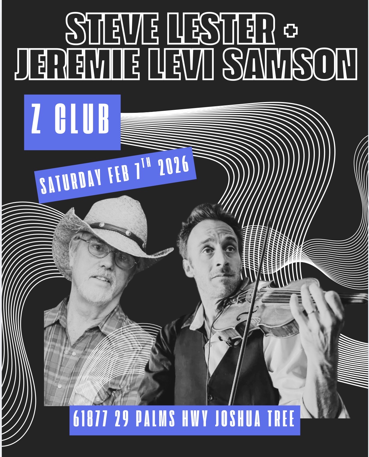 February 7 @ 7:00 pm - 10:00 pm Steve Lester + Jeremie Levi Samson Z Club Joshua Tree 61877 29 Palms Hwy., Joshua Tree, CA, United States