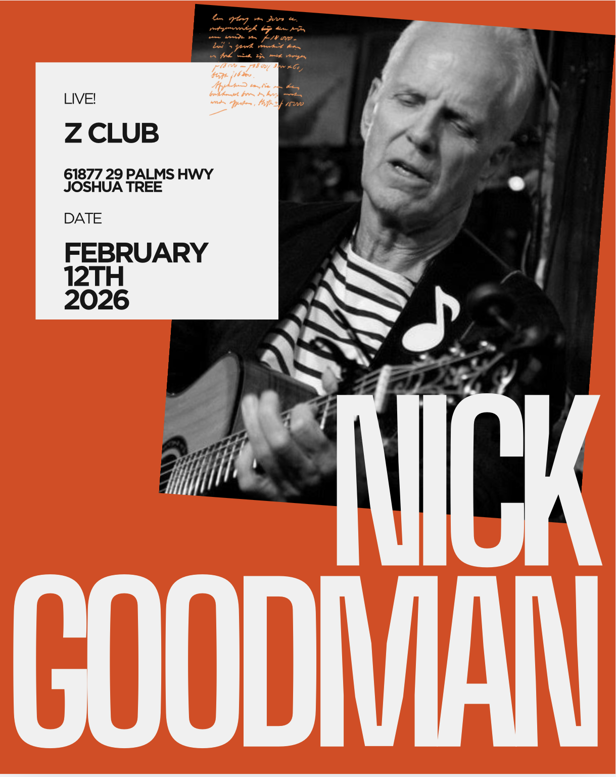 February 12 @ 7:00 pm - 10:00 pm Nick Goodman Z Club Joshua Tree 61877 29 Palms Hwy., Joshua Tree, CA, United States
