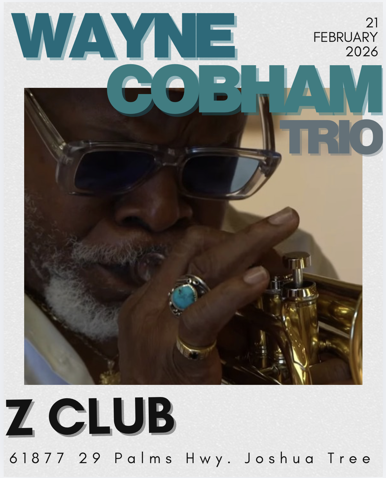 February 21 @ 8:30 pm - 9:30 pm Wayne Cobham Trio Z Club Joshua Tree 61877 29 Palms Hwy., Joshua Tree, CA, United States
