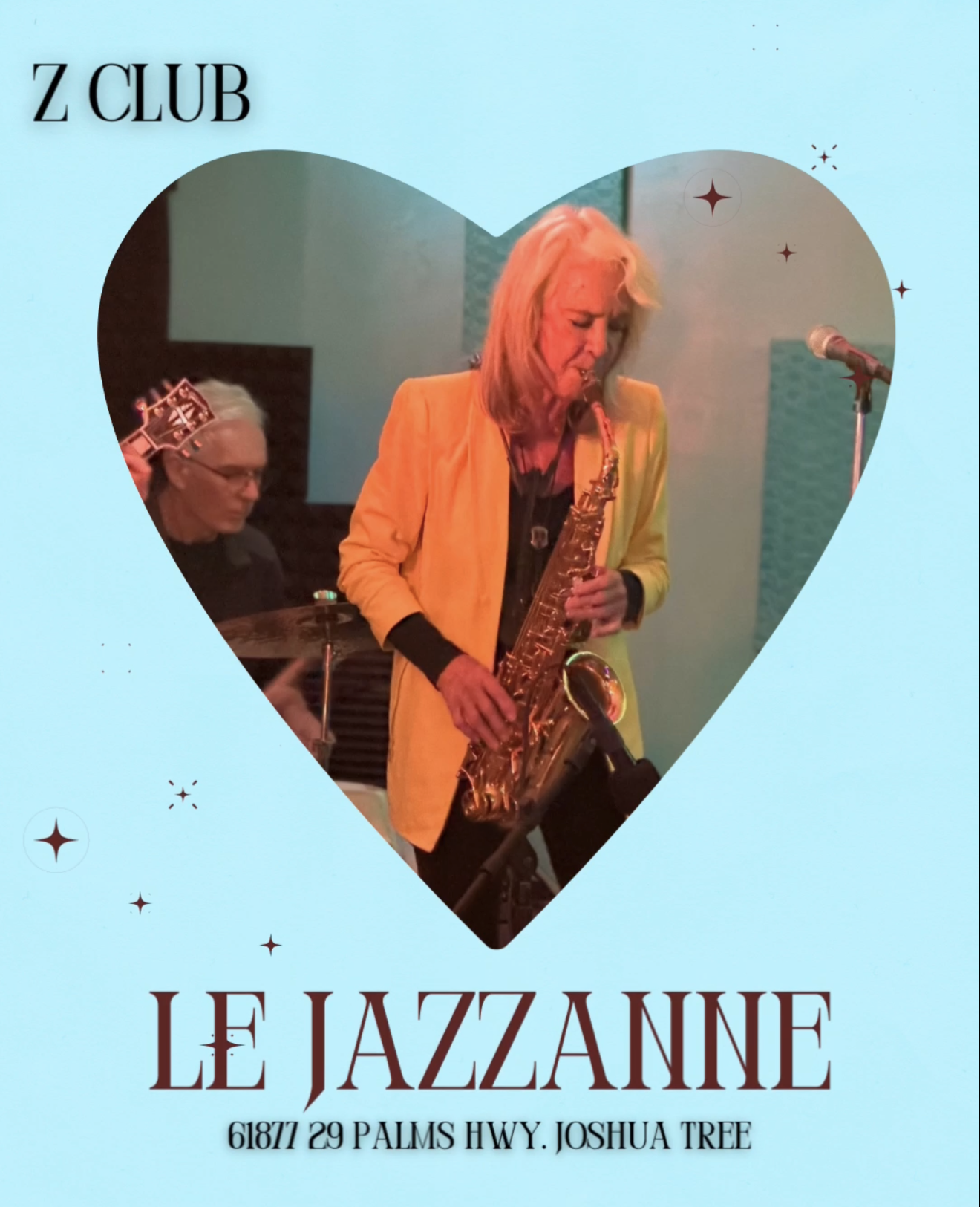 February 14 @ 7:00 pm - 10:00 pm Le Jazzanne Z Club Joshua Tree 61877 29 Palms Hwy., Joshua Tree, CA, United States