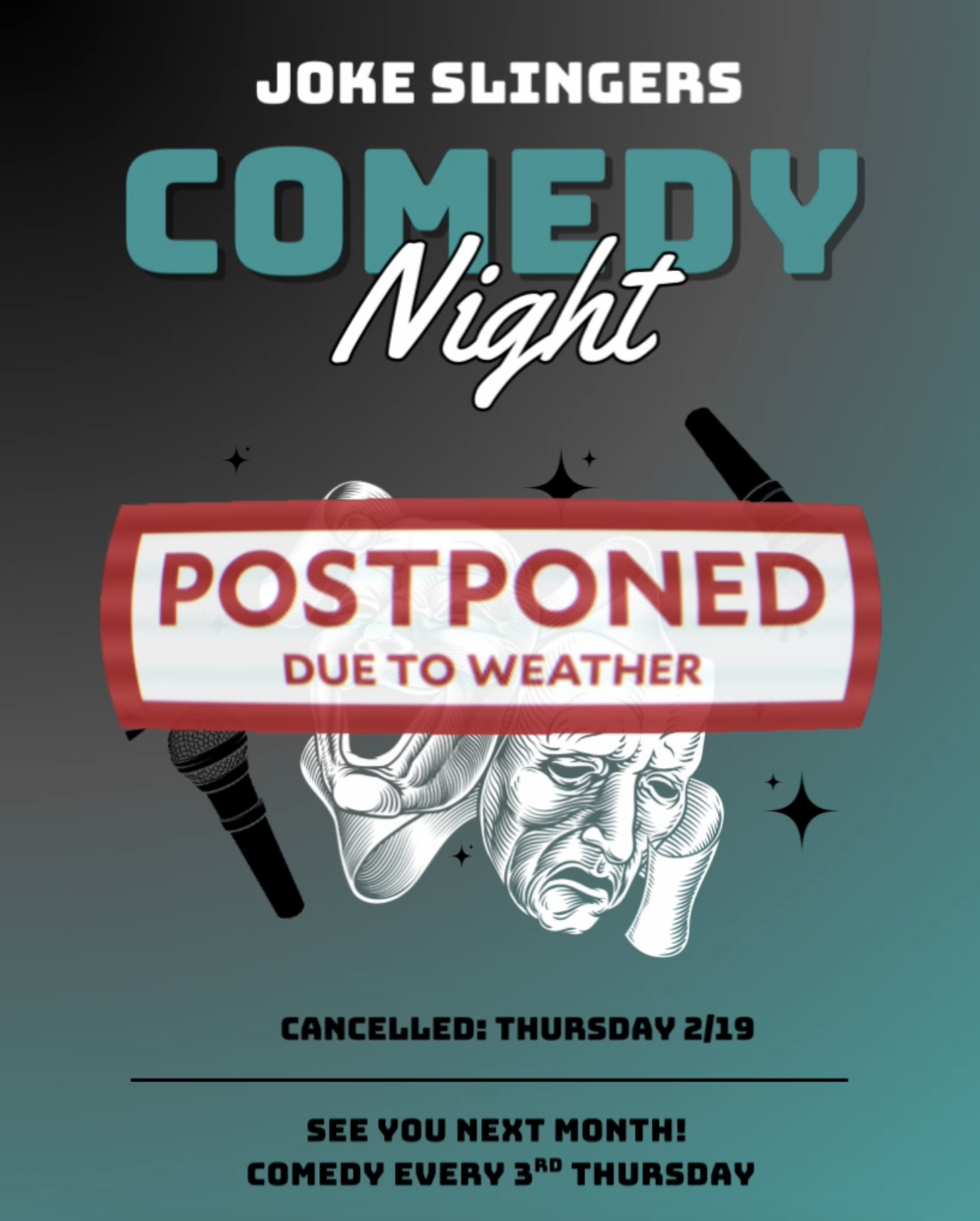 February 19 @ 8:00 pm - 10:00 pm Joke Slingers *UPDATE: Cancelled due to weather* See you the 3rd Thursday in March